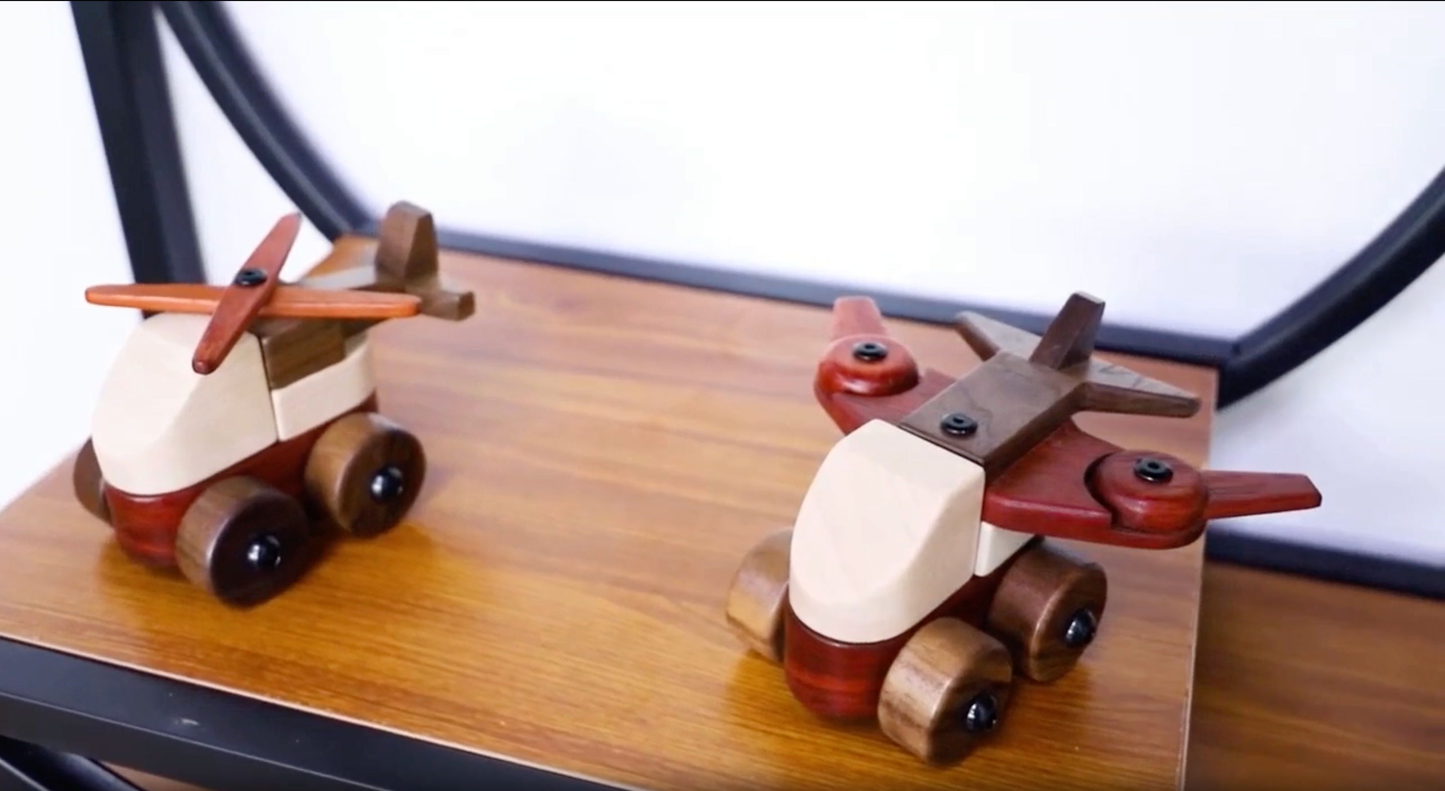 Each vehicle is carved from solid maple, warm walnut and naturally vibrant padauk—real wood with real grain, finished with child-safe natural oil. No dyes, no paint, no plastic parts. Just the true colours of the trees.